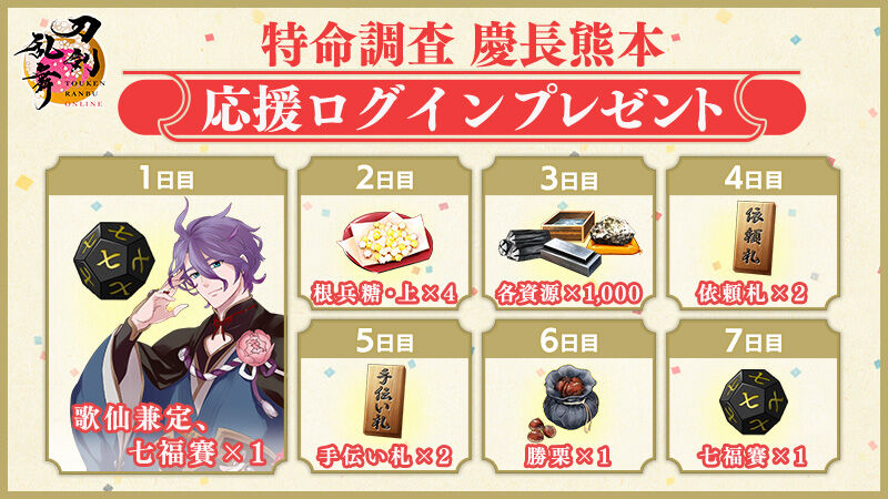 @TOUKEN_STAFF(1/2) 【催物情報】 催物「特命調査 慶長熊本」を開催いたします。本催物の舞台は放棄された世界、歴史改変された慶長熊本です。 <開催期間>10月1日(火)メンテナンス終了時~10月22日(火)12:59 ※詳細は、ゲーム内のお知らせをご確認ください。 #刀剣乱舞 #とうらぶ pic.x.com/Uk7Nlt8X1D