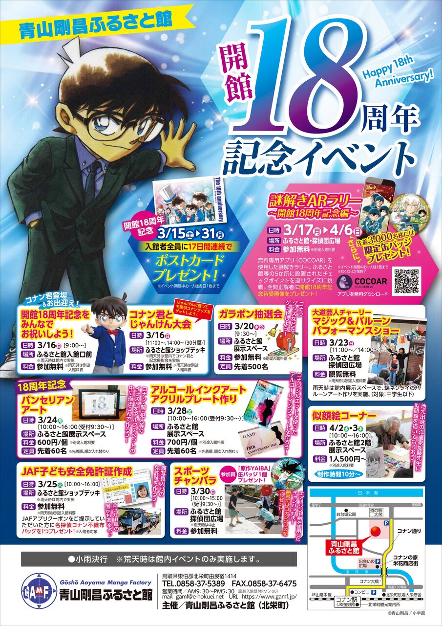 鳥取県北栄町の青山剛昌ふるさと館が18周年を迎え、特別なイベントが開催されています。入館者に人気キャラクターのポストカードが贈られるとのことで、これはファン必見の内容です。この記念すべき日を皆さんと一緒に祝いたいですね!ぜひ訪れてみてください!