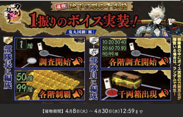 @TOUKEN_STAFF【催物情報】 催物「地下に眠る千両箱」を開催いたします。大阪城の地下を探索して、刀剣男士と小判を入手しましょう。 <開催期間>4月8日(火)メンテナンス終了時~4月30日(水)12:59 ※詳細は、ゲーム内のお知らせをご確認ください。 #刀剣乱舞 #とうらぶ pic.x.com/JjmvTAQHw3